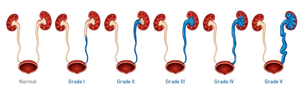 As a result of VCUG assessment, any VUR will be graded from I to V based on the dilation of the ureter and presence and degree of distortion of renal structures.